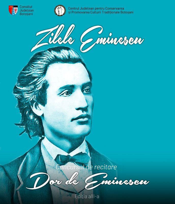 Centrul Județean pentru Conservarea și Promovarea Culturii Tradiționale Botoșani, cu sprijinul Consiliului Județean Botoșani, organizează în data de 15 ianuarie 2026, de la ora 16:00, la Teatrul de Copii și Tineret „Vasilache” din Botoșani, a treia ediție a Concursului de recitare „DOR DE EMINESCU”, în cadrul Zilelor Eminescu 2026.