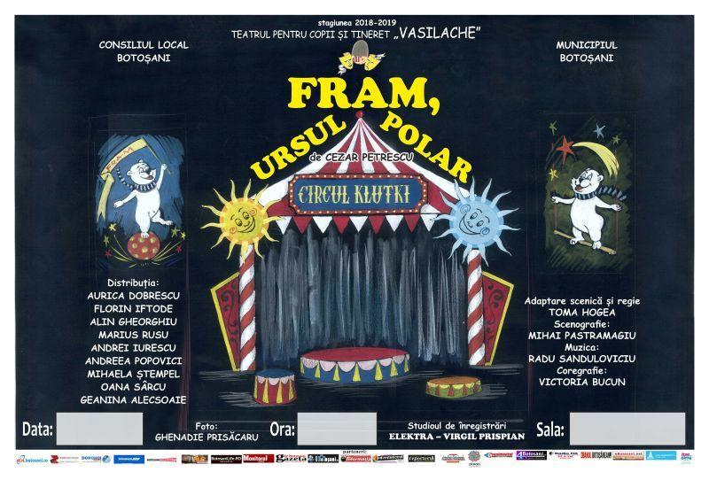 „Fram, ursul polar” este o poveste, din lumea circului, dorită și mult așteptată de copii. Transpunerea scenică aduce, pe scena Teatrului „Vasilache”, un spectacol plin de culoare, cu o muzică originală deosebită, cu actori, cu păpușari desăvârșiți, cu numere de pantomimă, specifice lumii/arenei circului, cu momente coregrafice de excepție și cu actori – păpușari care ating nivelul și măiestria textului.