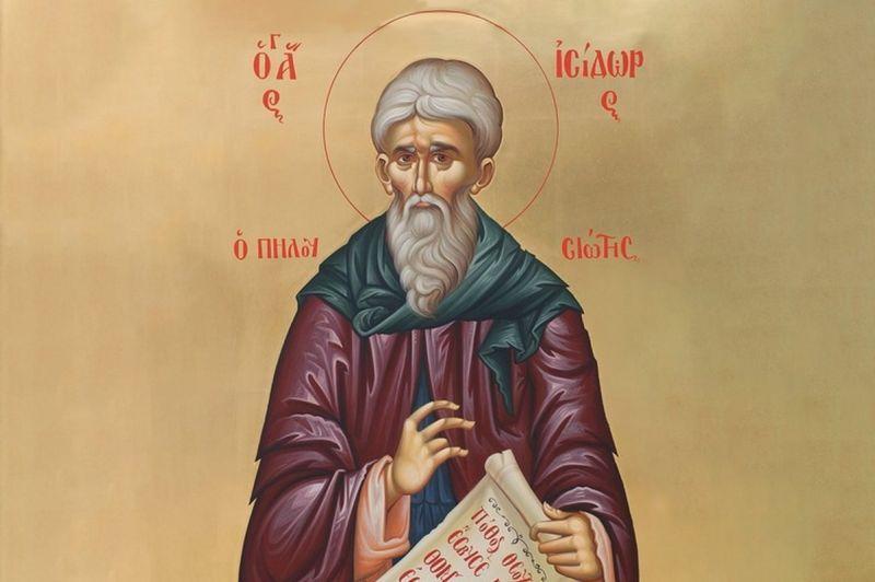 Sfântul Cuvios Isidor (†449) era egiptean de neam şi rudă cu Teofil şi Chiril, arhiepiscopii Alexandriei, vieţuind pe vremea împăratului Teodosie cel Mic (408-450). Isidor învăţase multă carte, luându-l ca pildă de viaţă şi lucrare pe Sfântul Ioan Gură de Aur. El era socotit de istoricii din vremea sa drept un filosof şi desăvârşit îndrumător în înţelepciunea vieţii şi a Sfintelor Scripturi. De tânăr a părăsit plăcerile acestei lumi, bogăţia şi strălucirea numelui, pe toate considerându-le ca fiind nefolositoare şi s-a dus într-o mănăstire din părţile Pelusiei, unde s-a făcut monah.