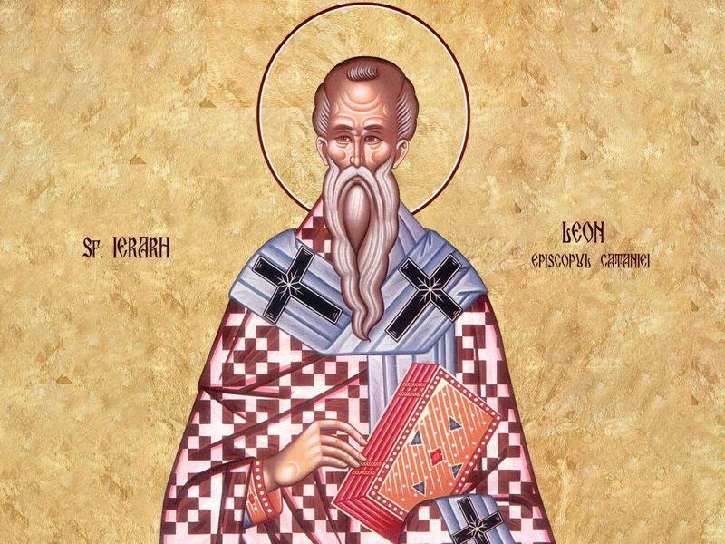 Sfântul Ierarh Leon (†787) era din cetatea Ravena, Italia, şi, trecând prin toate treptele clericale, a fost hirotonit episcop al cetăţii Catania, care este în insula Sicilia, unde se află şi vulcanul Etna. Leon ierarhul strălucea înaintea tuturor, luminând sufletele oamenilor încredinţaţi lui spre păstorire, ajutându-i pe orfani şi pe văduve şi îngrijindu-i pe cei nevoiaşi, încât s-a învrednicit şi de darul facerii de minuni. Din viaţa sa aflăm că, oarecând, numai cu rugăciunea a surpat la pământ un idol. De asemenea, a ridicat şi o frumoasă biserică în cinstea Sfintei Muceniţe Lucia, ocrotitoarea Siciliei.