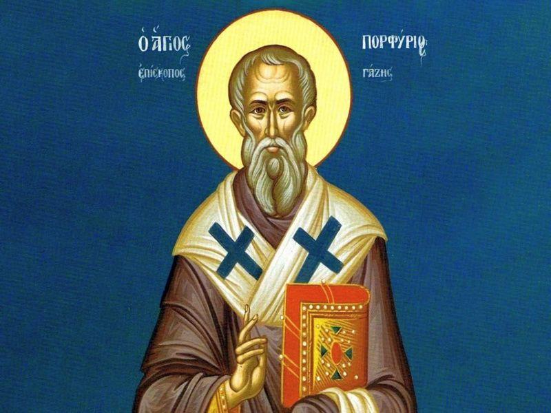 Sfântul Porfirie (†420) era din Tesalonic şi a fost crescut de părinţii săi în dreapta credinţă şi în viaţa cea după Evanghelie. Pe când avea 25 de ani, şi-a lăsat patria sa şi s-a dus în Egipt, făcându-se monah în pustiul Schetic, unde timp de cinci ani a trăit în aspre nevoinţe, în post aspru şi rugăciune multă. A mers apoi la Ierusalim să se închine la Locurile Sfinte şi aici l-a întâlnit pe călugărul Marcu, care i-a devenit ucenic.