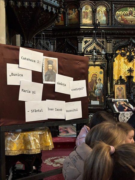 La prima cateheză, intitulată „Bunica Maria și sămânța credinței”, copiii, alături de părinți și bunici, au descoperit povestea Sfântului Ioan Iacob, sihastrul din Horodiștea. Printr-un joc numit „Cui îi datorez?”, cei mici au vorbit despre oamenii dragi din familie care îi învață să se roage sau îi duc de mână la biserică. Apoi, cu ajutorul unei „traiste” și al unor ilustrații, au ascultat povestea emoționantă a copilăriei Sfântului Ioan Iacob, crescut de bunica sa, Maria, care a renunțat la viața de mănăstire ca să își crească nepotul. Un moment care i-a impresionat pe toți a fost dialogul dintre micul Ilie și bunica lui, când acesta o întreba de ce plânge când citește patimile Domnului.