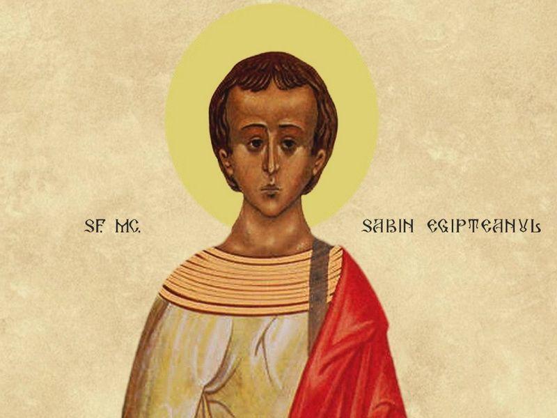 Sfântul Mucenic Sabin (†303) a fost din cetatea Hermopolis din Egipt şi era bărbat cucernic, având dregătorie mare în cetatea sa. Pe vremea împărăţiei lui Diocleţian (284-305), tulburându-se tot Egiptul din pricina prigonirii creştinilor, care erau ucişi pentru credinţa lor în Hristos-Domnul, Sabin şi-a lăsat casa, averea şi prietenii săi şi s-a retras într-un sat îndepărtat, vieţuind în post şi rugăciune într-o casă mică şi sărăcăcioasă.