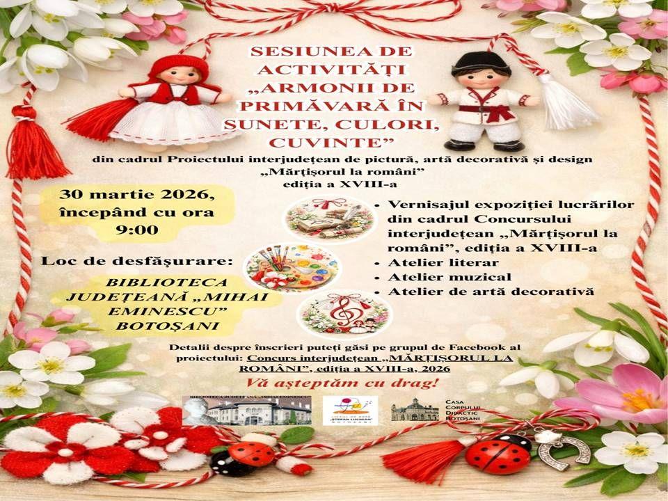 Biblioteca Județeană „Mihai Eminescu” Botoșani găzduiește luni, 30 martie 2026, începând cu ora 9,00, în spațiile Filialei Primăverii, Filialei Grivița și Secției împrumut carte pentru copii, sesiunea de activități ”Armonii de primăvară în sunete, culori, cuvinte” din cadrul Proiectului interjudețean de pictură, artă decorativă și design „Mărțișorul la români”, și anume: Atelier de pictură ”Primăvară în culori”, Atelierul de confecționare fire de mărțișoare ”Mărțișoare muzicale” și Atelierul de pantomimă ”Primăvară animată”.