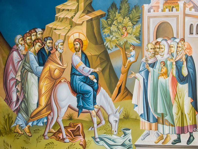 A doua zi Mântuitorul a trimis „pe ucenicii Săi să-I aducă asina şi mânzul ei”. A intrat în Ierusalim plin de smerenie „pe mânzul asinei”, fiind aclamat de popor. Au fost puse înaintea Lui „veşminte şi ramuri de finic; unii le aruncau pe cale, iar alţii le purtau în mâini şi strigau, mergând înaintea Lui: „Osana Fiului lui David! Binecuvântat este Cel ce vine întru numele Domnului, Împăratul lui Israel!”