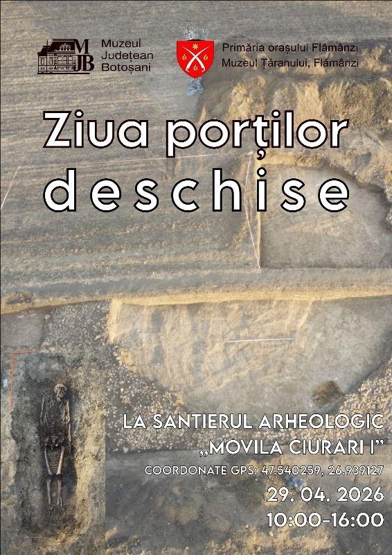 Muzeul Județean Botoșani, prin Secția Istorie-Arheologie și Memorialistică, în colaborare cu Primăria Orașului Flămânzi și cu Muzeul Țăranului din Flămânzi, invită publicul interesat de desfășurarea cercetărilor științifice de teren la „Ziua porților deschise” la șantierul arheologic „Movila Ciurari I”, accesibil la coordonatele GPS 47.540259, 26.939127.
