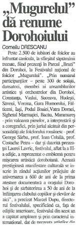 Salut demersul d-nei profesoare Gheorghina Guşulei, care s-a axat într-o lucrare de grad I pe folclorul local, şi, în acelaşi timp, apreciez modul în care d-l profesor Corneliu Drescanu, un înainte-mergător al spiritualităţii spaţiului botoşănean, a revelat coordonatele temei. Felicitări amândurora!