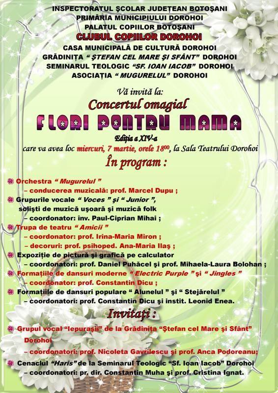 Miercuri, 7 martie 2012, începând cu ora 18.00, la Sala Teatrului Dorohoi, va avea loc spectacolul “Flori pentru mama”, ediţia a XIV-a, organizat de Clubul Copiilor Dorohoi, cu sprijinul Inspectoratului Şcolar Judeţean Botoşani şi al Primăriei municipiului Dorohoi, în parteneriat cu Palatul Copiilor Botoşani, Grădiniţa „Ştefan cel Mare şi Sfânt” Dorohoi, Asociaţia „Mugurelul”, Seminarul Teologic Liceal „Sf. Ioan Iacob” şi Casa Municipală de Cultură Dorohoi.