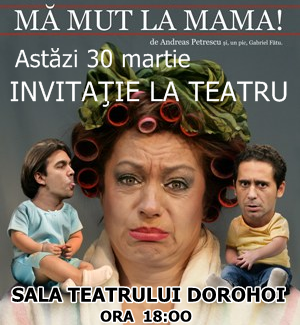 În această seară, la ora 18:00, pe scena Sălii Teatrului din Dorohoi, se va juca piesa de teatru: „Mă mut la mama!”