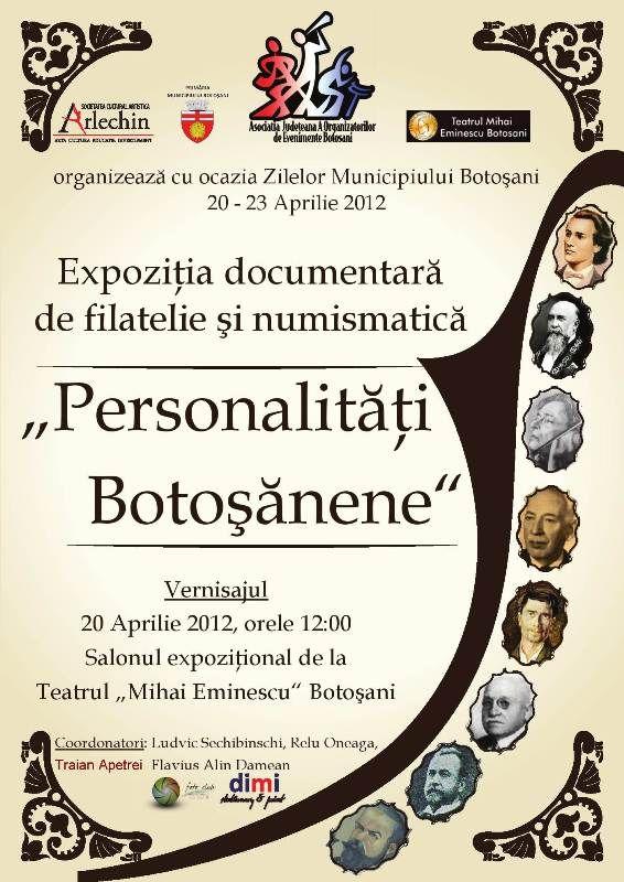 Asociatia Culturala ARLECHIN Botosani, Asociatia Judeteana a Organizatorilor de Evenimente Botosani (AJOEBT), Primaria Municipiului Botosani, Teatrul “Mihai Eminescu” Botosani, in colaborare cu Clubul Fotografilor Botosani (CFBT) si Centrul Europe Direct Botosani, organizeaza in perioada 20- 23 Aprilie 2012, prima expozitie documentara de filatelie si numismatica ”Personalitati Botosanene“.