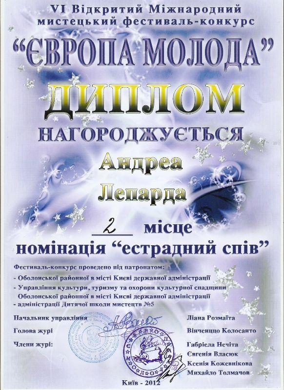 De curand ea a participat la unul dintre cele mai mari festivaluri din Ucraina, Internaţional Art Festival „Young Europe” de la Kiev, care s-a desfăşurat în perioada 26 aprilie-1 mai 2012, unde a obtinut premiul al II-lea. (DorohoiNews.ro)