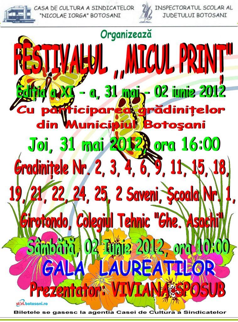 În perioada 31 mai – 02 iunie 2012, Casa de Cultură a Sindicatelor „Nicolae Iorga” Botoşani, în colaborare cu Inspectoratul Şcolar al Judeţului Botoşani, organizează Festivalul Concurs „Micul Prinţ” ediţia a XI-a.