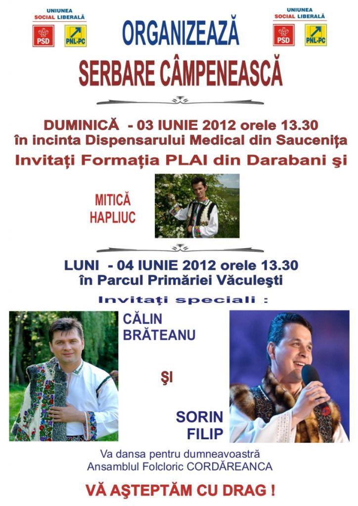 Luni 4 iunie, începând cu oră 13:30, în parcul primăriei Vaculești, sunt așteptați interpreții Călin Brăteanu și Sorin Filip și Ansamblul Folcloric Cordăreanca care va dansa pentru dumneavoastră.