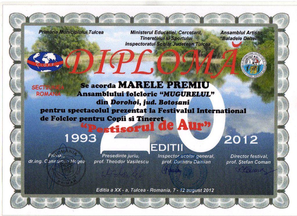 MARELE PREMIU castigat de Ansamblul „Mugurelul” la Festivalul Internaţional de Folclor pentru copii si tineret “PEŞTIŞORUL DE AUR” ediţia a XX-a Tulcea - România