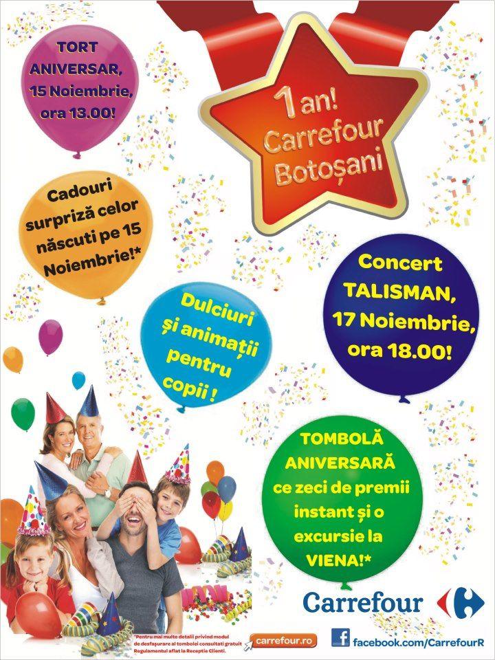 Botosani Shopping Center si Carrefour implinesc un an de cand si-au deschis portile pentru prima data la noi in oras. Botosanenii sunt invitati cu mic cu mare la prima lor aniversare! In perioada 15- 17 noiembrie la Botosani Shopping Center organizatorii vor pregati multe surprize ce se vor concluziona cu un concert extraordinar.