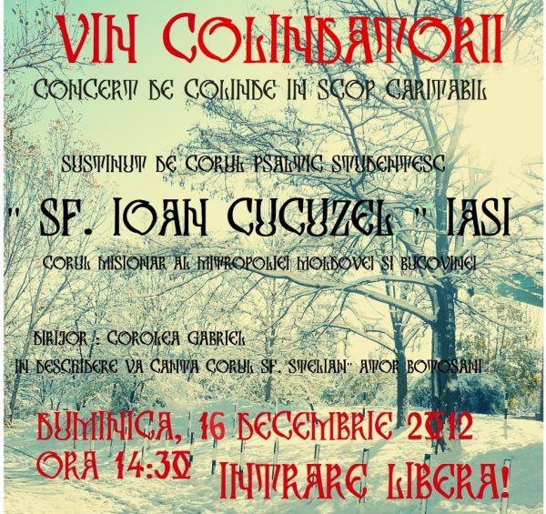 Mitropolia Moldovei si Bucovinei împreună cu Asociația "Salvează o inimă" din Botoșani. vă invită Duminică 16 decembrie 2012 ora 14:30 la Teatrul Mihai Eminescu la concertul caritabil "Vin colindătorii". Concert de colinde susținut de Corul Misionar al Mitropoliei Moldovei si Bucovinei "Sf. Ioan Cucuzel", avându-l Dirijor pe Gabriel Corolea. În deschiderea evenimentului va concerta Corul "Sf.Stelian" - A.T.O.R Botoșani