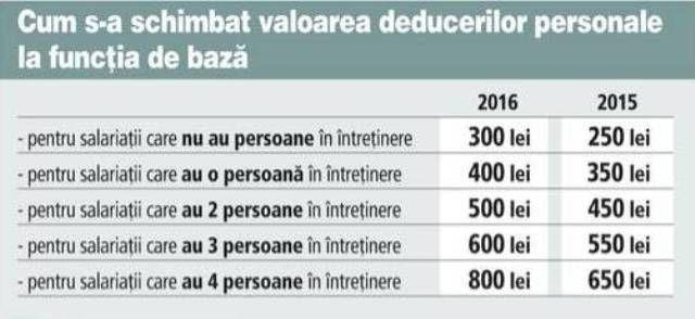 La un salariu de 2.847 de lei brut în 2015 (adică 2.000 de lei net anul trecut), deducerea personală pentru funcţia de bază era de 30 de lei. Începând din acest an, deducerea crescut la valoarea de 40 de lei, deci salariul net al angajatului creşte cu doar 3 lei pe lună.