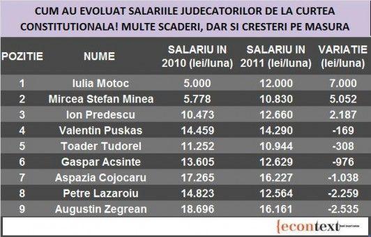 Salariile unor judecători de la Curtea Constituţională din România (CCR) s-au dublat anul trecut! În doar un an, salariul judecătoarei Iulia Motoc a urcat de la 5.000 de lei pe luna în 2010, până la 12.000 de lei pe luna în 2011, potrivit Econtext.