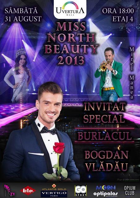 Cel mai mare concurs de miss desfășurat în Botoşani, „Miss North Beauty 2013” va avea loc la Uvertura Mall, sâmbătă, 31 august, de la orele 18:00. În juriu va fi Bogdan Vlădău, vedeta emisiunii „Burlacul”.
