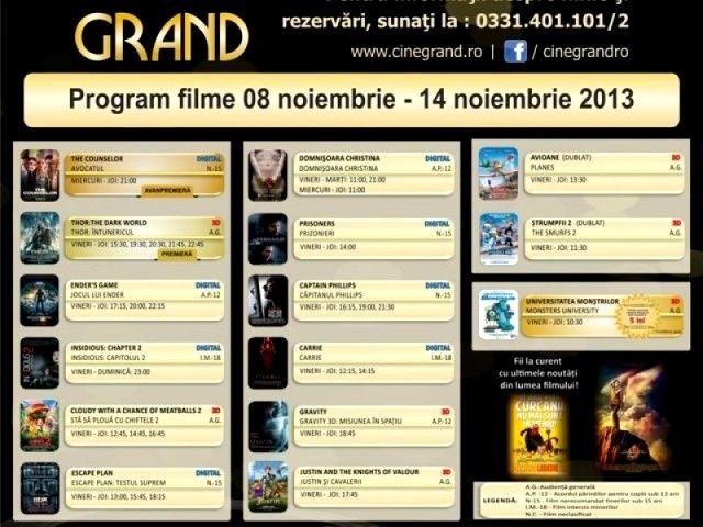 În perioada 8-14 noiembrie 2013, la Cine Grand din incinta Uvertura Mall vor rula 15 filme. Vezi care sunt acestea și la ce ore rulează: