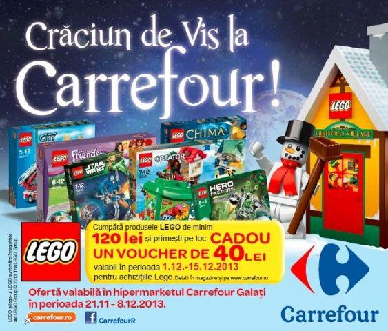 -cumpărând produse LEGO de minim 120 de lei din magazinele „Carrefour”, clienții primesc cadou un voucher de 40 de lei valabil în perioada 1 – 15 decembrie 2013, pentru noi achiziții LEGO