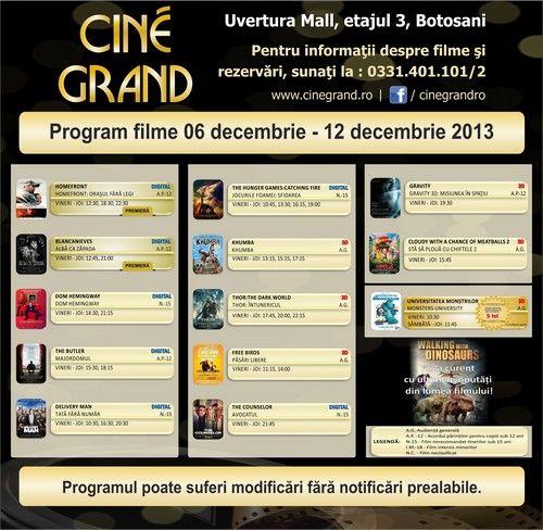 În perioada 6-12 decembrie 2013, la Cine Grand din incinta Uvertura Mall vor rula 13 filme. Vezi care sunt acestea și la ce ore rulează: