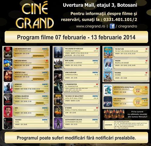 În perioada 7 - 13 februarie 2014, la Cine Grand din incinta Uvertura Mall vor rula 19 filme. Vezi care sunt acestea și la ce ore rulează:
