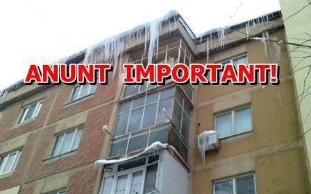 Primăria municipiului Dorohoi aduce la cunoștință tuturor proprietarilor din blocurile de locuit de pe raza municipiului Dorohoi, în special celor care locuiesc la ultimul etaj și care au construit șarpate că au obligația să semnalizeze zona și să îndepărteze prin orice mijloace țurțurii de gheață care se formează în anotimpul rece ca urmare a scurgerii apei de pe suprafața șarpantei, țurțuri sau cantități de zăpadă acumulate pe acoperiș care pun în pericol siguranța, bunurile și viața persoanelor aflate în trazit prin zona respectivă.