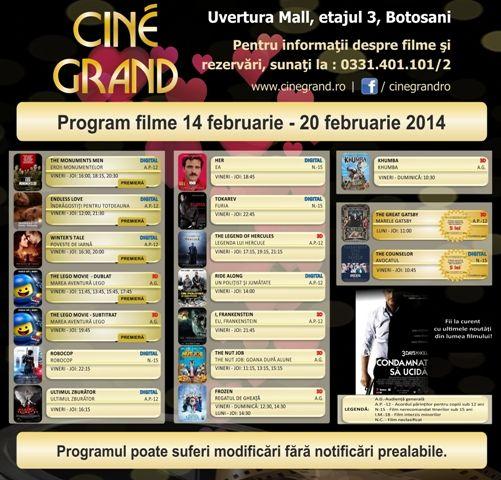 În perioada 14 - 20 februarie 2014, la Cine Grand din incinta Uvertura Mall vor rula 17 filme. Vezi care sunt acestea și la ce ore rulează: