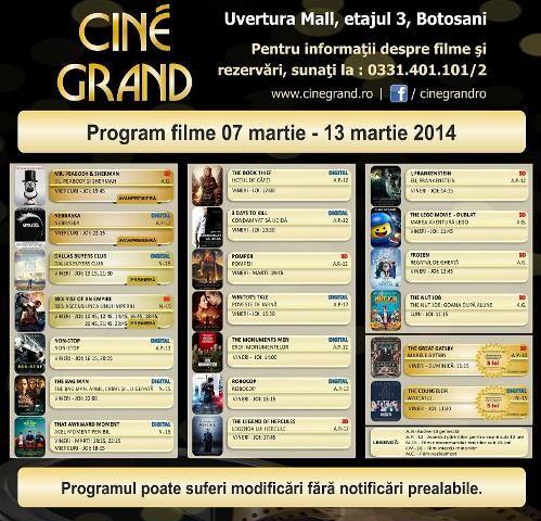 În perioada 7-13 martie 2014, la Cine Grand din incinta Uvertura Mall vor rula 20 filme. Vezi care sunt acestea și la ce ore rulează: