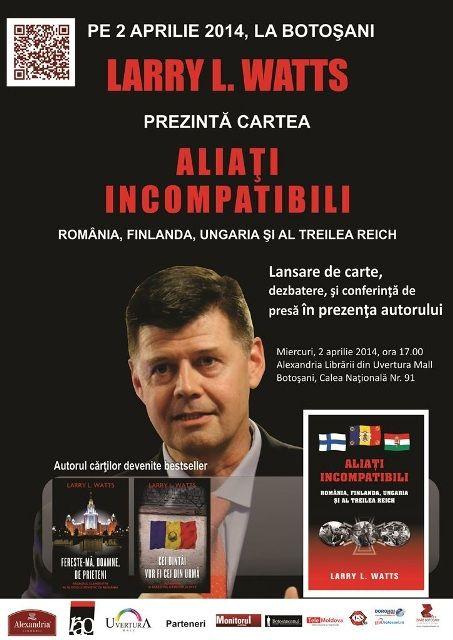 Alexandria Librarii, Uvertura Mall şi Editura Rao organizează miercuri, 2 aprilie 2014, începând cu ora 17.00, lansarea celei mai recente cărţi semnate de Larry L. Watts, Aliaţi incompatibili. România. Finlanda. Ungaria şi al treilea Reich. Evenimentul va avea loc în librăria Alexandria, etajul 3, Uvertura Mall Botoşani.
