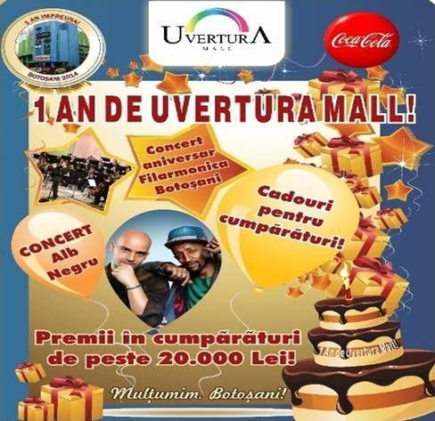 În week-endul 29, 30 martie Uvertura Mall sărbătorește 1 an de la inaugurare. Concertul aniversar extraordinar al Filarmonicii din Botoșani, concertul Alb Negru, tombola aniversară cu cele peste 3000 de premii garantate și premiul de 5000 de lei sunt doar o parte din surprizele pentru botoșăneni.