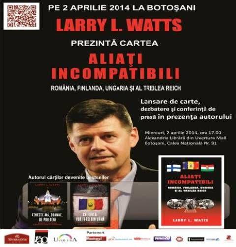 Alexandria Librarii, Uvertura Mall şi Editura Rao organizează miercuri, 2 aprilie 2014, începând cu ora 17.00, lansarea celei mai recente cărţi semnate de Larry L. Watts, Aliaţi incompatibili. România. Finlanda. Ungaria şi al treilea Reich. Evenimentul va avea loc la etajul 3, Uvertura Mall Botoşani. Consultant al Corporaţiei RAND la momentul revoluţiei, Larry Watts a călătorit deseori în Europa de Est şi în URSS înainte de 1989. Ulterior a asistat oficiali din România la înfiinţarea Colegiului Naţional de Apărare şi a conlucrat cu mai mulţi miniştri români ai Apărării şi şefi de stat major privind reforma în domeniul armatei, cooperarea cu Parteneriatul pentru Pace şi integrarea în NATO. În 1990 şi 1991 a fost şeful Biroului IREX din Bucureşti, iar până în 1997 a fost senior consultant al Project on Ethnic RElation (PER) şi director al Biroului PER din România. Între 2001–2004 a activat drept consultant pentru reforma sectorului de securitate pe lângă consilierul prezidenţial pentru securitate naţională din România.