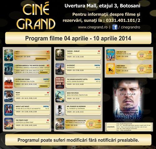 În perioada 4 – 10 aprilie 2014, la Cine Grand din incinta Uvertura Mall vor rula 14 filme. Vezi care sunt acestea și la ce ore rulează: