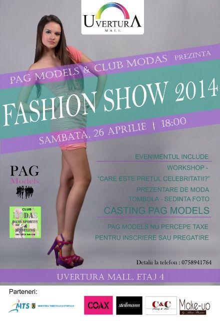 Sâmbătă, 26 aprilie, la etajul patru al Uvertura Mall va avea loc un super eveniment – FASHION SHOW 2014. Evenimentul va cuprinde un workshop pe tema agențiilor de modeling - "Care este prețul celebrității?" cu invitați speciali din instituții abilitate și o prezentare de modă în care veți putea evalua nivelul manechinelor pregătite de PAG Models în colaborare cu Club MODAS.