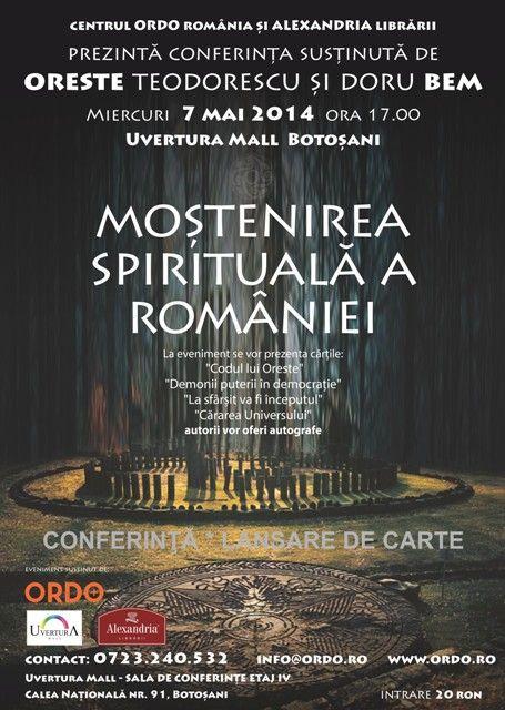 Centrul ORDO România, Uvertura Mall şi Alexandria Librării vă invită miercuri, 07 mai 2014 la conferinţa susţinută de Oreste Teodorescu şi Doru Bem denumită Moştenirea spirituală a României. Evenimentul va avea loc în Sala de Conferinţe, etaj IV din Uvertura Mall Botoşani, începând cu ora 17.00. La manifestare se vor prezenta cărţile “Codul lui Oreste”, “Demonii puterii în democraţie”, “La sfârşit va fi începutul” şi “Cărarea Universului” iar cei doi autori vor oferi autografe.
