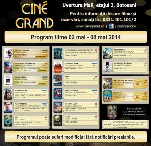 În perioada 2 - 8 mai 2014, la Cine Grand din incinta Uvertura Mall vor rula 16 filme. Vezi care sunt acestea și la ce ore rulează: