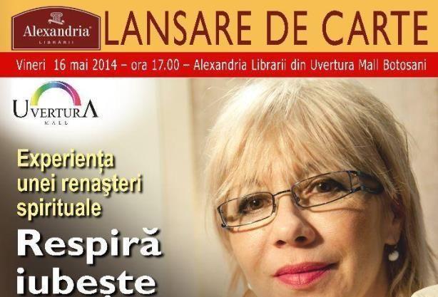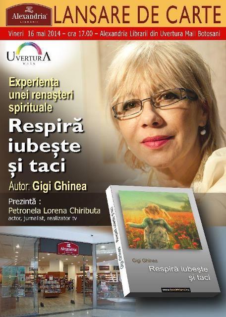 Alexandria Librării, Uvertura Mall și Asociaţia Money for Help organizează vineri, 16 mai evenimentul de lansare a cărții „Respiră, iubește și taci” semnate de doamna psiholog Gigi Ghinea. Evenimentul va avea loc la etajul III al Uvertura Mall, la ora 17.00, cartea fiind prezentată de Petronela Lorena Chiribuţă, actor, jurnalist și realizator tv.