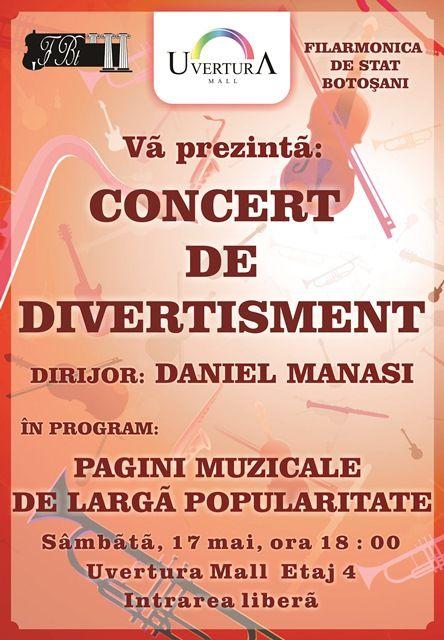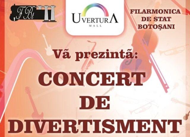 Uvertura Mall va găzdui sâmbătă, 17 mai 2014, începând cu ora 18:00, la etajul 4, un concert de divertisment susținut de Filarmonica de Stat Botoșani.
