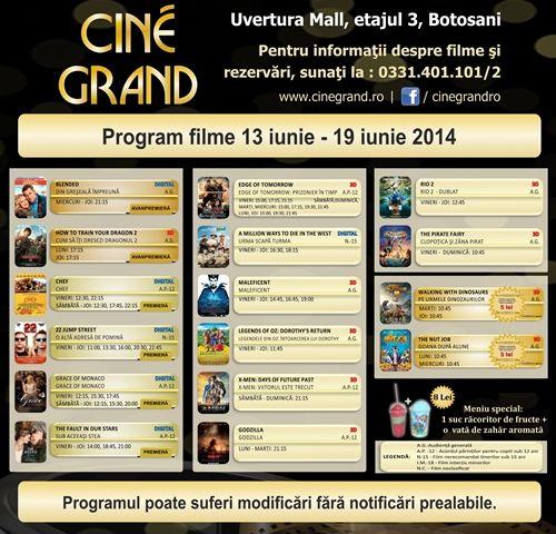 În perioada 13 - 19 iunie 2014, la Cine Grand din incinta Uvertura Mall vor rula 16 filme. Vezi care sunt acestea și la ce ore rulează:
