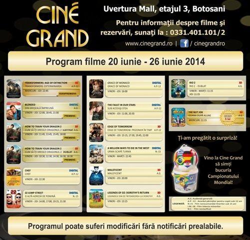 În perioada 20 - 26 iunie 2014, la Cine Grand din incinta Uvertura Mall vor rula 14 filme. Vezi care sunt acestea și la ce ore rulează:
