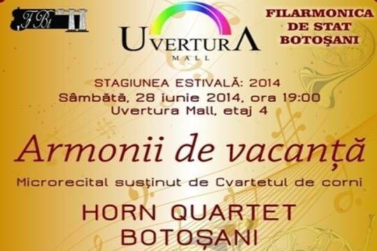 ”Armonii de vacanță” este un recital extraordinar susținut de Filarmonica de Stat Botoșani, prin cvartetul de corni ”Horn Quartet Botoșani”, sâmbătă, 28 iunie, de la 19:00, la etajul patru al Uvertura Mall.