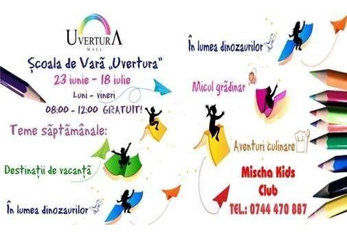 Invitații diferiți de la zi la zi, jocurile și materialele special pregătite, au rolul de a dezvolta imaginația și de a stimula setea de cunoaștere. Copii se distrează, socializează și învață lucruri noi într-un mediu plăcut și interactiv. Înscrieri se pot face zilnic, pe tot parcursul programului (10:00 – 22:00), la spațiul de joacă Mischa Kids de la etajul 3 - partenerul Școlii de vară Uvertura.