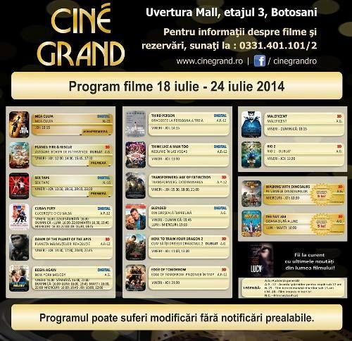 În perioada 18 – 24 iulie 2014, la Cine Grand din incinta Uvertura Mall vor rula 16 filme. Vezi care sunt acestea și la ce ore rulează: