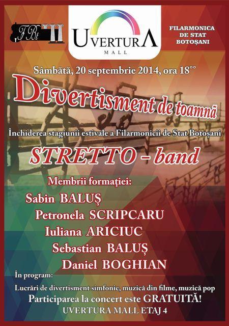 Sâmbătă, 20 septembrie, începând cu ora 18:00, la etajul patru al Uvertura Mall va avea loc evenimentul ”Divertisment de toamnă”, un extraordinar microrecital susținut de ”STRETTO-band”.