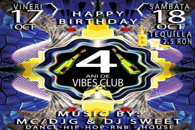 Weekendul acesta sarbatorim impreuna 4 ani de Vibes Club „Happy birthday Vibes Club” vineri si sambata 17-18 oct 2014. Te premiem pentru distractie, music by mc/djg & djsweet: dance-hip-hop-rnb - house tot ceea ce tine de muzica comerciala si petrecere!
