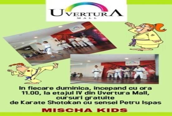 Duminică, 19 octombrie 2014, între ore 11:00 - 12:00 la etajul patru al Uvertura Mall, va avea loc un curs gratuit de karate pentru copii, unde sunt invitați toți copii dornici de mișcare și distracție.
