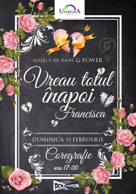 Duminică, 15 februarie 2015, începând cu orele 17:00, la etajul 4 al Uvertura Mall, Școala de dans G-Power invită toate cuplurile să învețe o coregrafie pe piesa "Vreau totul înapoi" cântată de botoșăneanca Francisca, finalista de la X Factor. După ce o va preda pe înțelesul tuturor (dansator sau începători) la final această coregrafie va fi filmată și postată pe pagina de Facebook a Școlii de dans G-Power.
