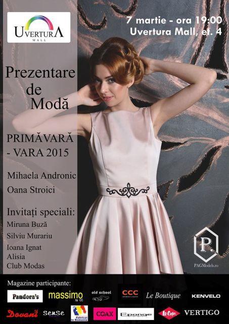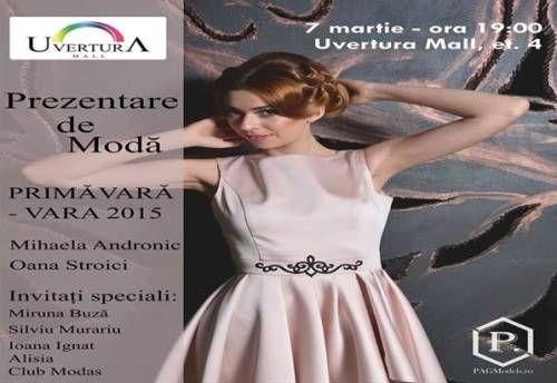 Sâmbătă, 7 martie 2015, începând cu orele 19:00, la etajul 4, Uvertura Mall va găzdui Prezentarea de Modă a Primăverii. Veți avea ocazia să vedeți noile colecții primăvară-vară a brandurilor pe care le găsiți în Uvertura Mall: Lee Cooper, Kenvelo, Sense, Old School, Eponge, Massimo by CC, Pandora's, Fabricat în România, CCC, Dovani, Coax, Vertigo și Le Boutique cât și colecțiile designerilor Mihaela Andronic și Oana Stroici.