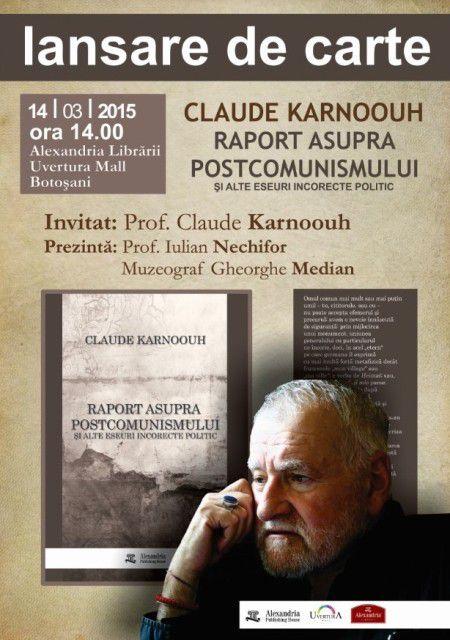 Volumul Raport asupra postcomunismului şi alte eseuri incorecte politic, publicat în noiembrie 2014 la Alexandria Publishing House „antologhează publicisticasemnificativă a gânditorului Claude Karnoouhîntre 2009 și 2012”, după cum afirma Aurel T. Codoban, specialist în comunicare și profesor la Universitatea Babes-Bolyai în recenzia pe care a făcut-o acestui volum. “Îi admir prea mult retorica de intelectual francez, bine și fin acordată, îi prețuiesc prea mult excepționala erudiție care îi furnizează numeroasele asociații care țes și susțin textura unei argumentații mereu concrete și redutabile pentru a încerca să-i rezum mai mult ideile și concluziile”, continua acesta în aceeași recenzie.